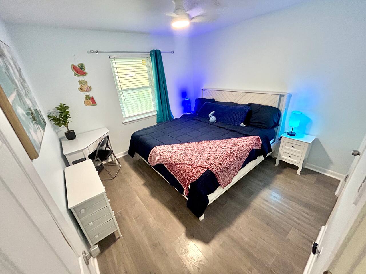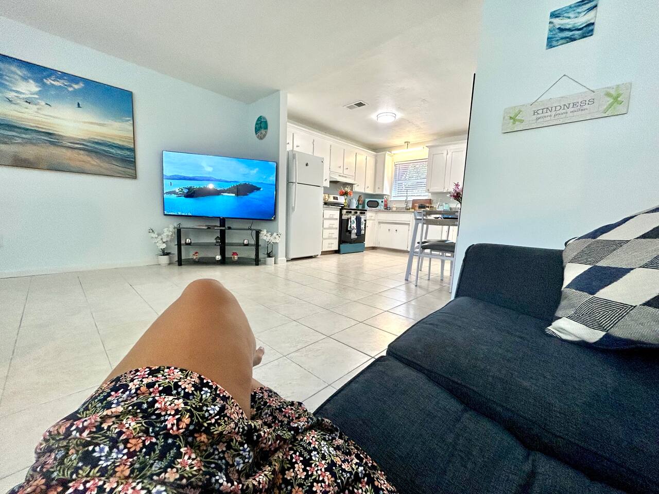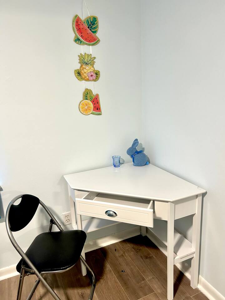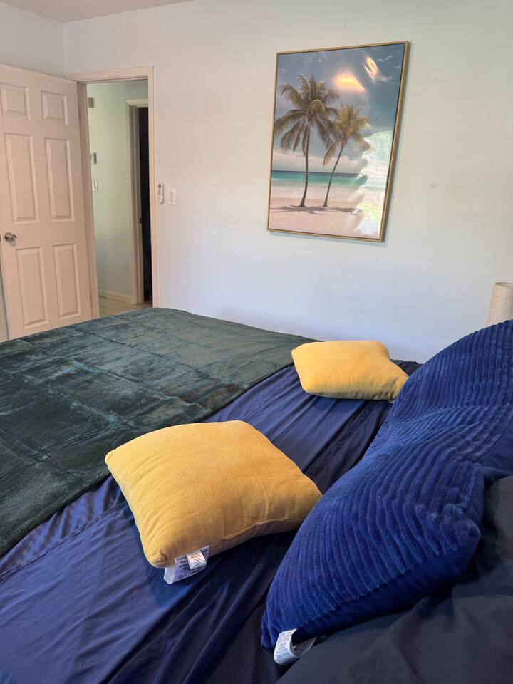 Cozy 2BR – King Beds, Office Desks, Backyard, Near Beach Spacious and comfortable 2-bedroom single story apartment with two king size beds, an extra sofa bed setup, full kitchen, 58” smart TV, and in-unit washer/dryer. Includes two desks for remote work and a dining area. Enjoy the fully fenced backyard with shady trees, patio, and watch squirrels and birds roam. Free parking and an easy drive to beaches, shopping, and local spots. Simple, quiet, and ready for your stay.