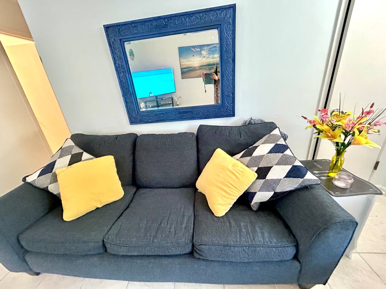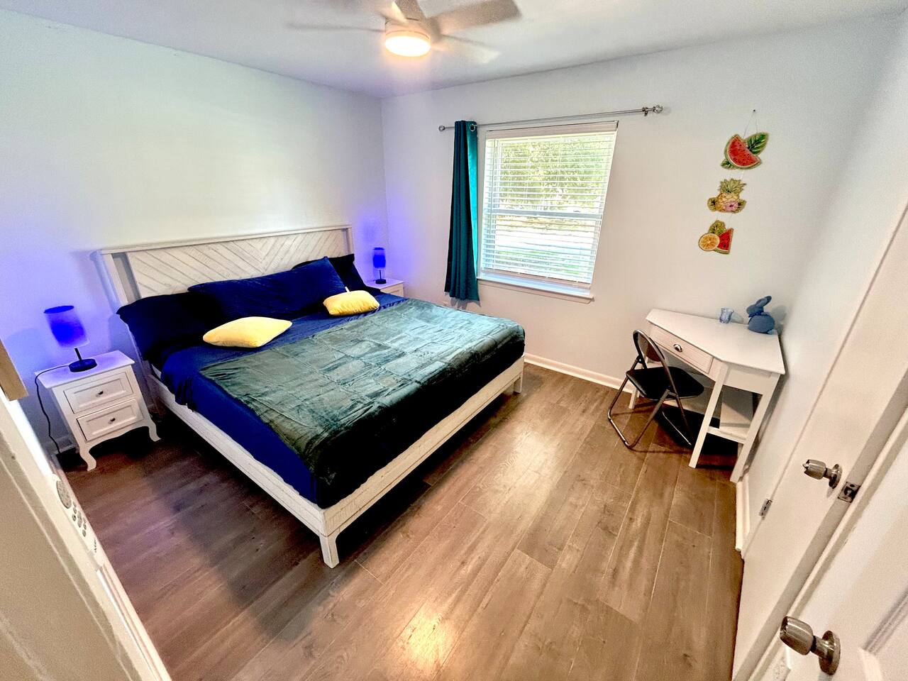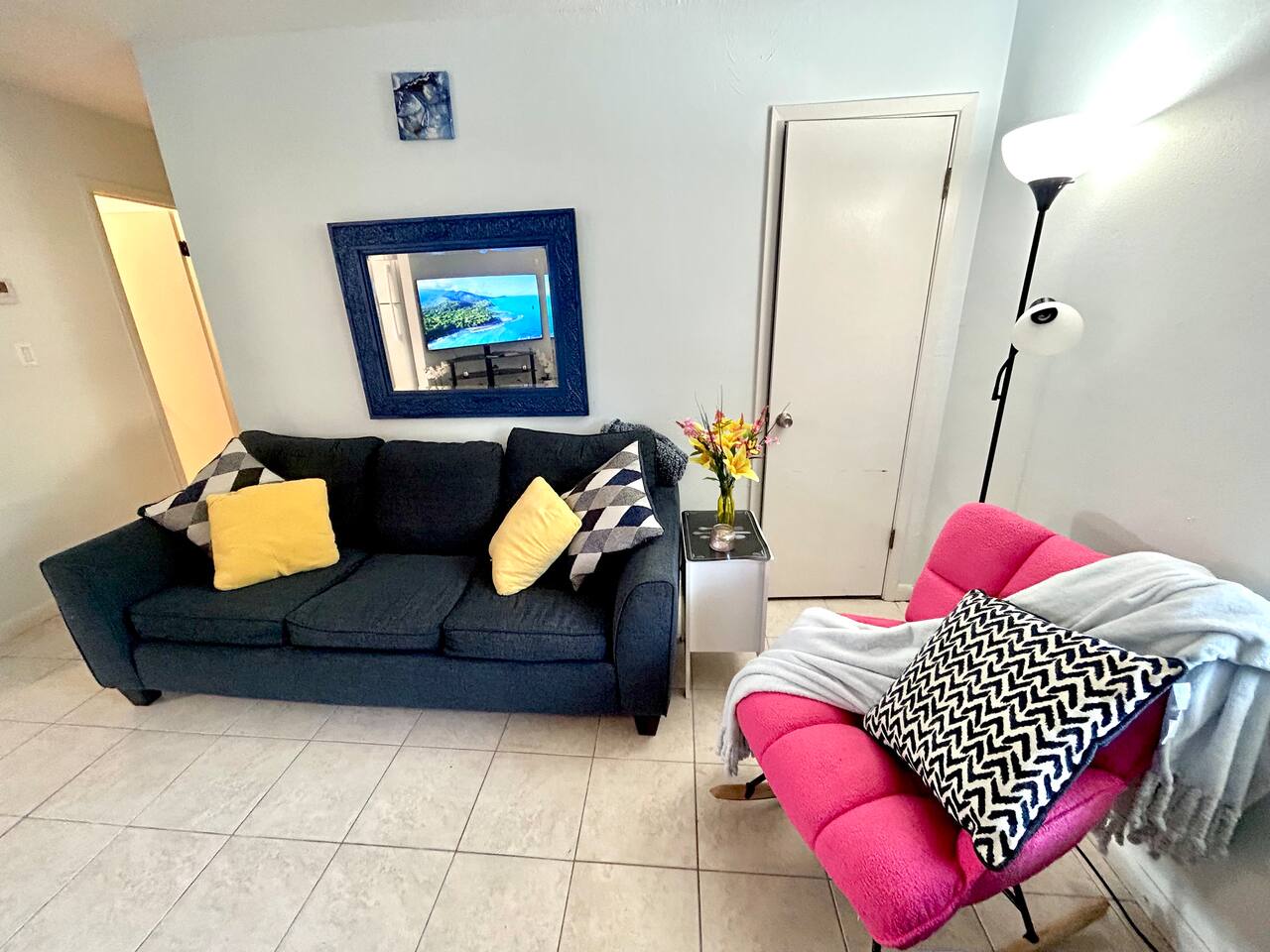 Cozy 2BR – King Beds, Office Desks, Backyard, Near Beach Spacious and comfortable 2-bedroom single story apartment with two king size beds, an extra sofa bed setup, full kitchen, 58” smart TV, and in-unit washer/dryer. Includes two desks for remote work and a dining area. Enjoy the fully fenced backyard with shady trees, patio, and watch squirrels and birds roam. Free parking and an easy drive to beaches, shopping, and local spots. Simple, quiet, and ready for your stay.