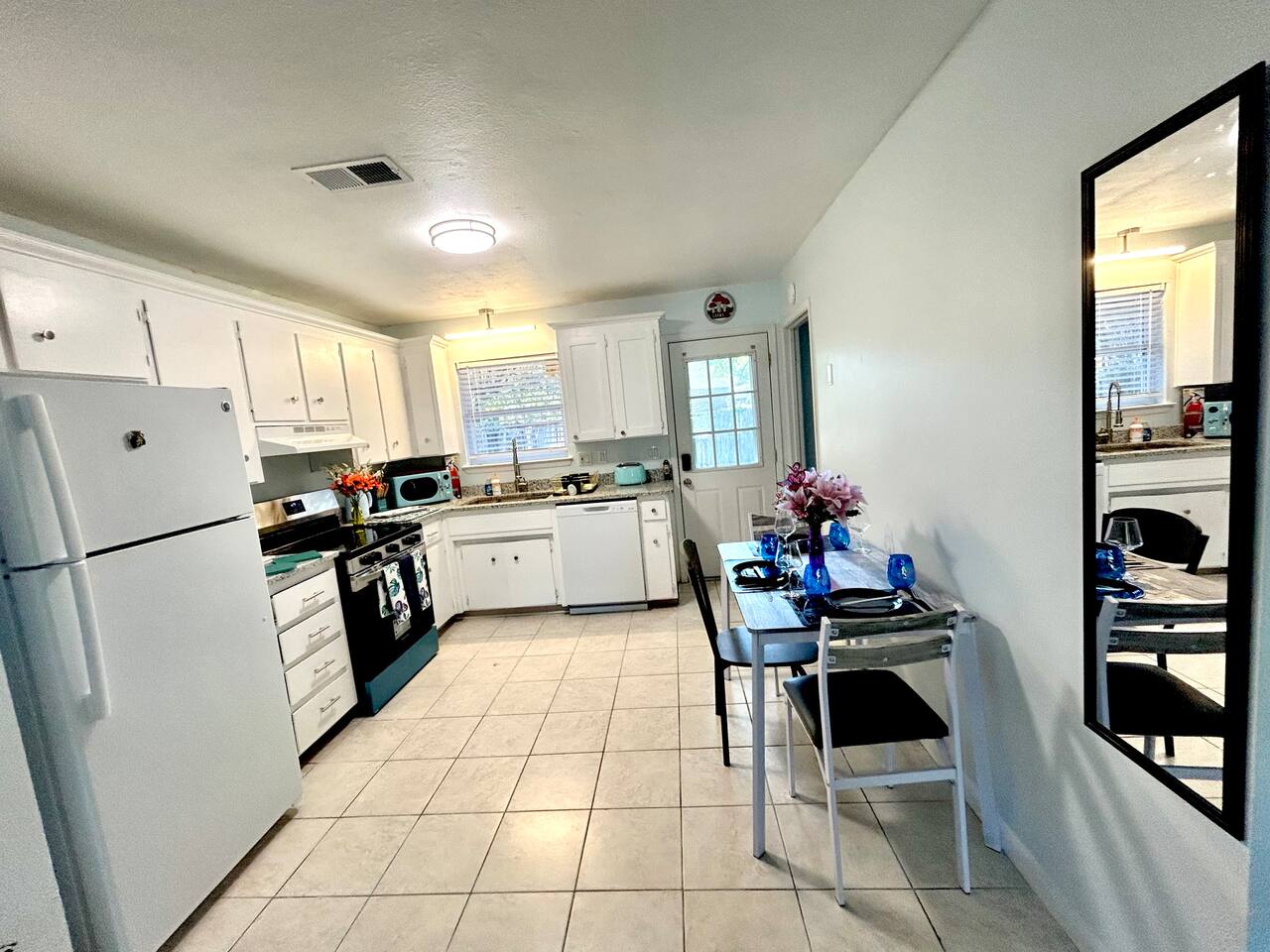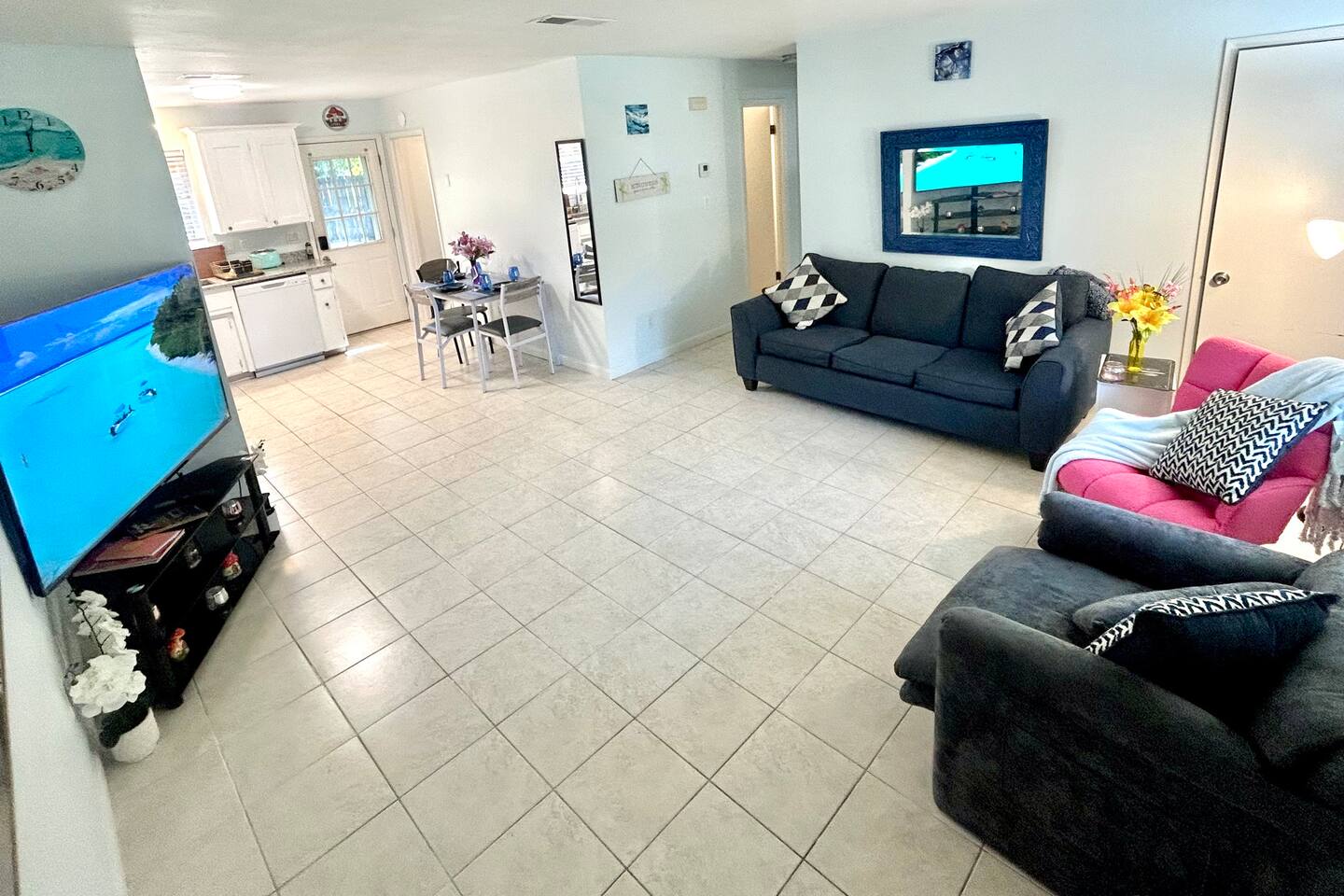 Cozy 2BR with King Beds, Office Space & Yard – Close to Everything Welcome to your home away from home in Pensacola. This comfortable two-bedroom, one-bath unit is a great fit for anyone needing a clean, spacious place to stay—whether you're here for work, school, or just a visit. Each bedroom has a king-size bed, and there’s also a sofa and an extra sleeping option in the living area. The living room has a 65-inch smart TV and fast Wi-Fi, so you can relax or get some work done with ease. The kitchen is fully equipped with full-size appliances, a Keurig, cookware, and a dining table for four. There are also two desk areas if you need to work remotely during your stay. You’ll find fresh towels and a tub/shower combo in the bathroom, plus an on-site washer and dryer to make longer stays more convenient. Outside, enjoy a private backyard with a few trees, a small patio area, and a grill—great for a little fresh air and downtime. Please note: While we’ve made a number of updates like granite counters, re painted cabinets, appliances, and fresh paint, this is still an older property. If you don’t mind a few minor imperfections here and there, we’d be happy to have you stay with us. There’s free parking for two or more vehicles and you’ll be just a short drive from: Pensacola Beach – 25 minutes Perdido Key – 33 minutes Downtown Pensacola – 16 minutes Navy Federal – 7 minutes UWF – 10 minutes Airport – 10 minutes West Florida Hospital – 11 minutes NAS – 23 minutes We hope to make your stay comfortable and easy, and we’re here if you need anything.
