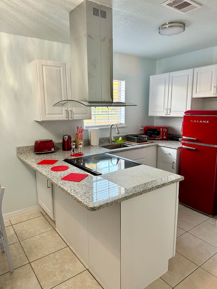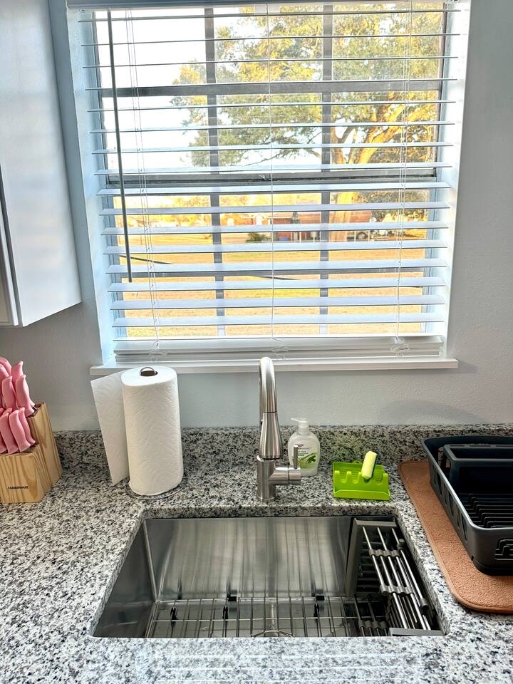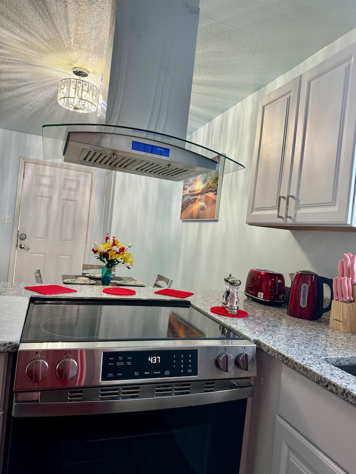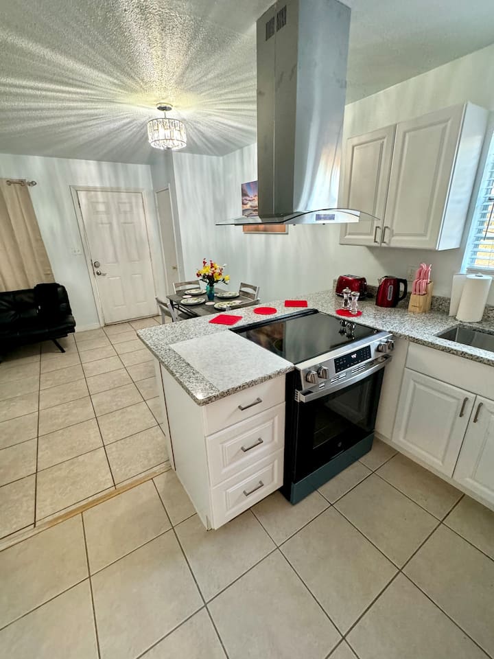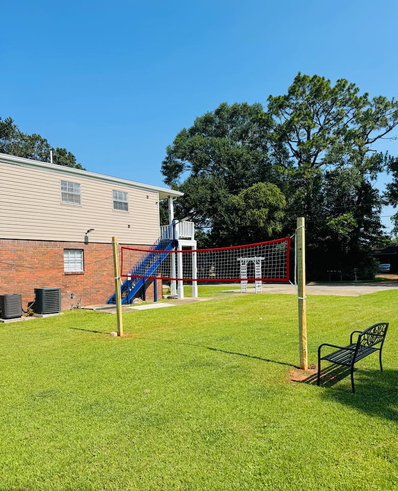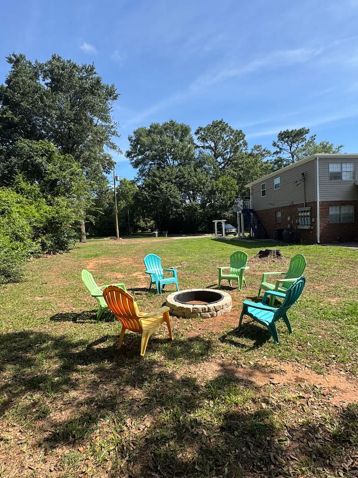 Wake up to birds singing and, if you’re lucky, spot wild bunnies in the yard. Guests have access to a grill, volleyball net, and shared laundry. Inside: king bed, 60" smart TV, new cabinets, granite countertops, appliances, and a vent hood. Extensively remodeled, but some of the original features like flooring, windows, and doors were preserved. Located in a quiet quadplex on a cul‑de‑sac near restaurants and local spots. Drive times: • Pensacola Beach – 25 min • Perdido Key Beach – 33 min • Navy Federal – 7 min • UWF – 10 min • Airport – 10 min • West Florida Hospital – 11 min • Downtown – 16 min • NAS – 23 min