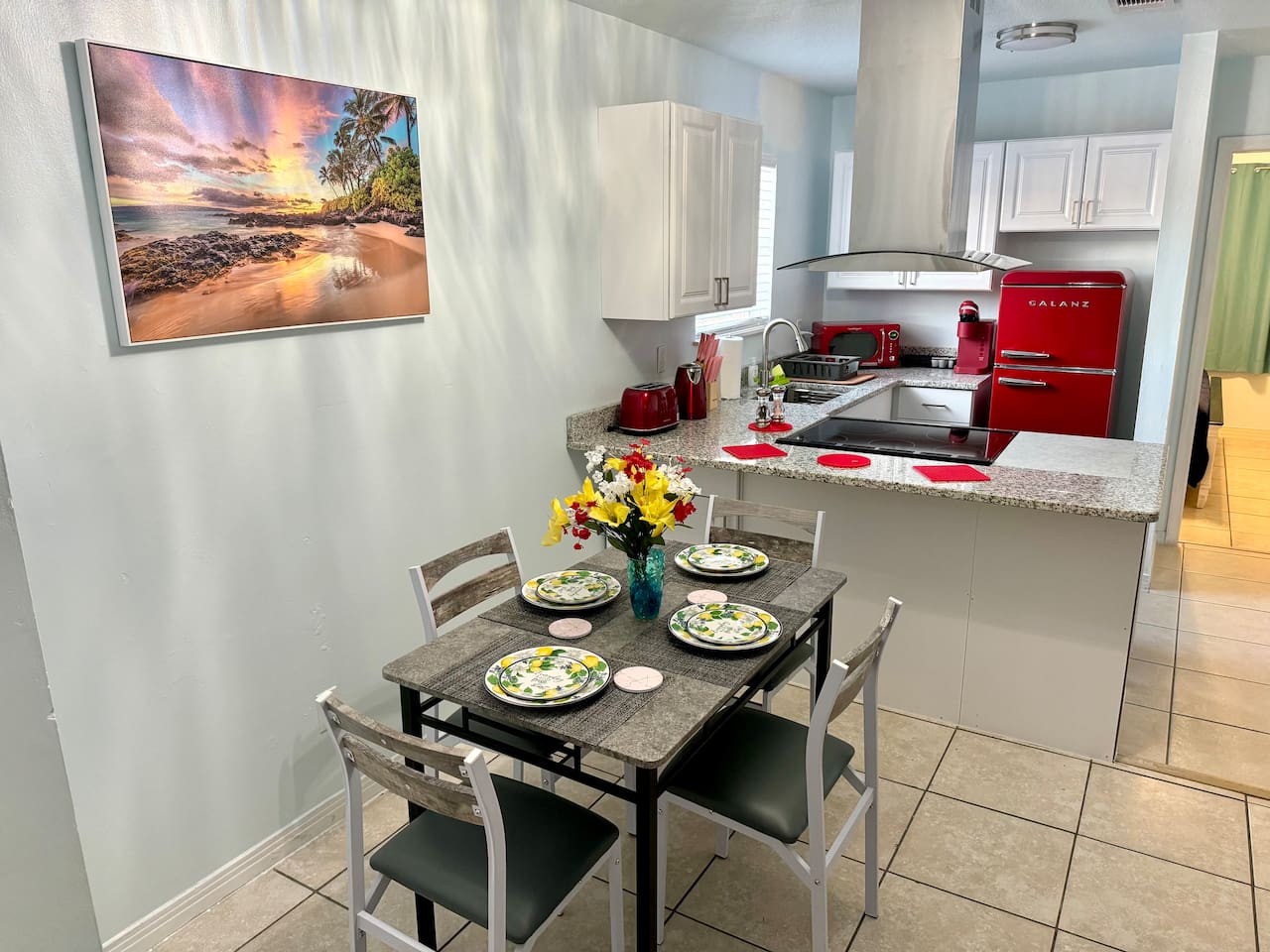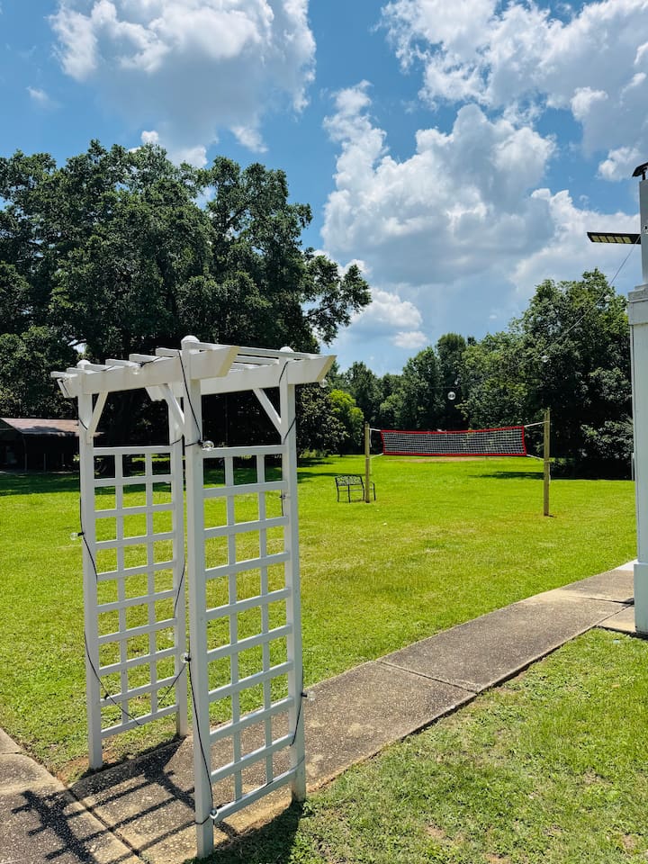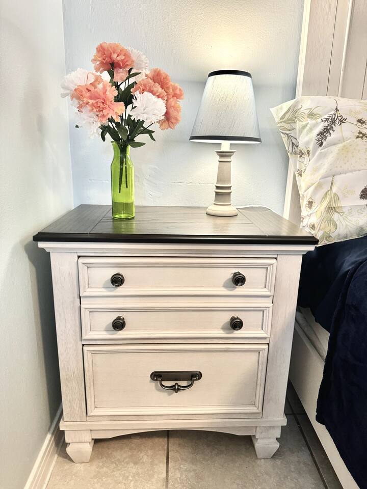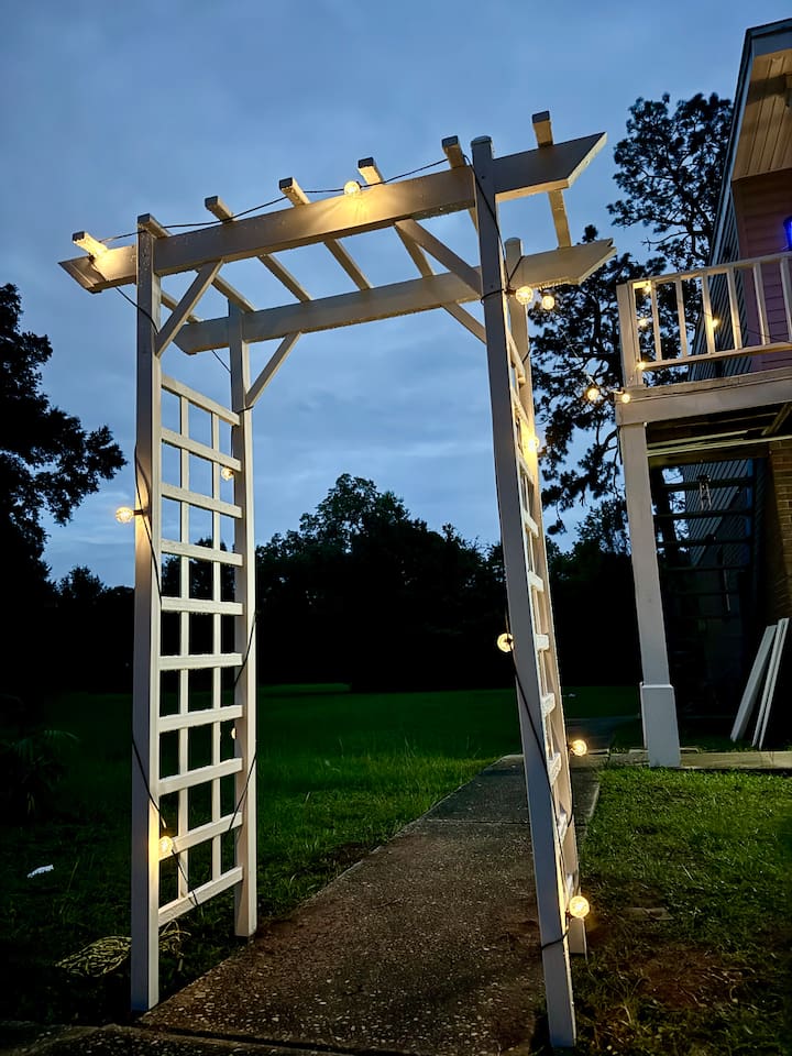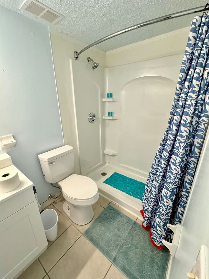 Wake up to birds singing and, if you’re lucky, spot wild bunnies in the yard. Guests have access to a grill, volleyball net, and shared laundry. Inside: king bed, 60" smart TV, new cabinets, granite countertops, appliances, and a vent hood. Extensively remodeled, but some of the original features like flooring, windows, and doors were preserved. Located in a quiet quadplex on a cul‑de‑sac near restaurants and local spots. Drive times: • Pensacola Beach – 25 min • Perdido Key Beach – 33 min • Navy Federal – 7 min • UWF – 10 min • Airport – 10 min • West Florida Hospital – 11 min • Downtown – 16 min • NAS – 23 min