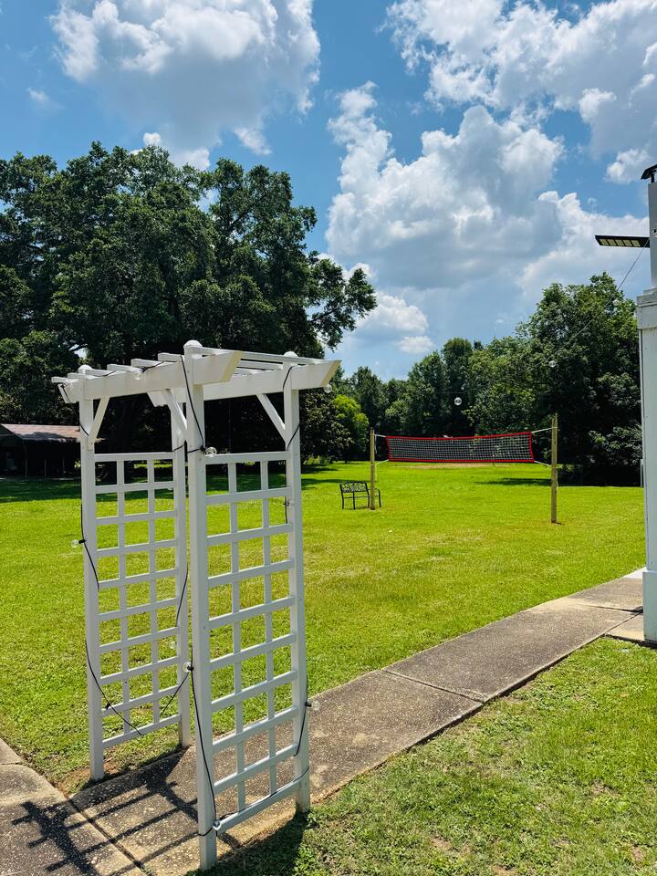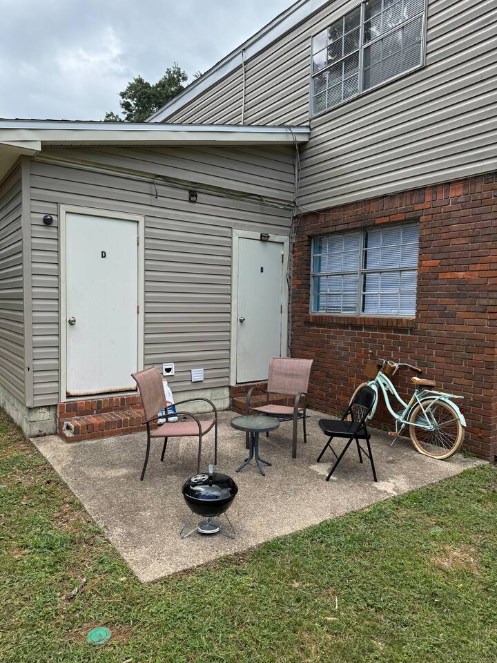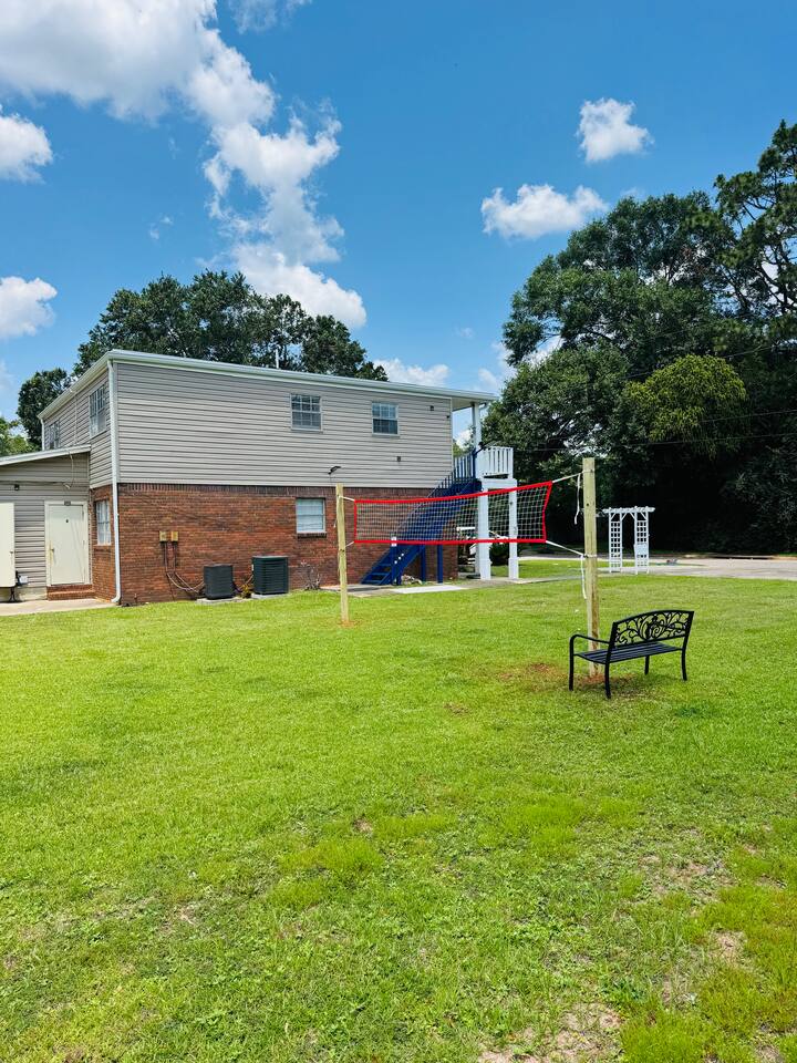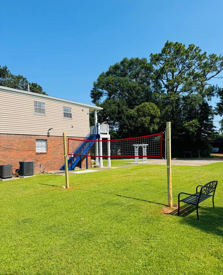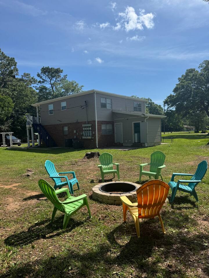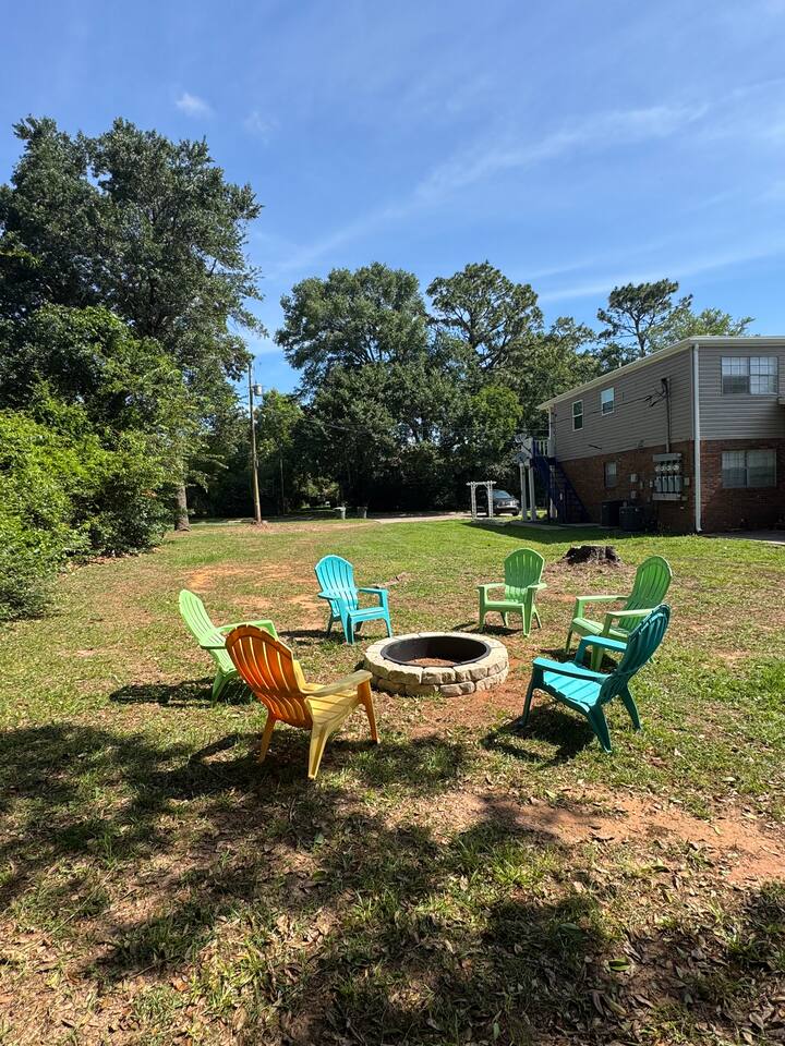 Inside: King bed with blackout curtains 60” smart TV for streaming High-speed Wi-Fi (suitable for remote work and video calls) Retro kitchen with granite countertops and full cookware Updated cabinets, fixtures, and appliances Outdoor shared amenities: Fire pit with seating Volleyball net Grill and picnic gazebo Large, tree-lined yard Shared laundry (washer and dryer) on site This unit is part of a quiet quadplex on a cul-de-sac — peaceful but close to everything. Drive times: Pensacola Beach – 25 minutes Perdido Key – 33 minutes Navy Federal – 7 minutes UWF – 10 minutes Airport – 10 minutes West Florida Hospital – 11 minutes Downtown / Palafox – 16 minutes NAS – 23 minutes