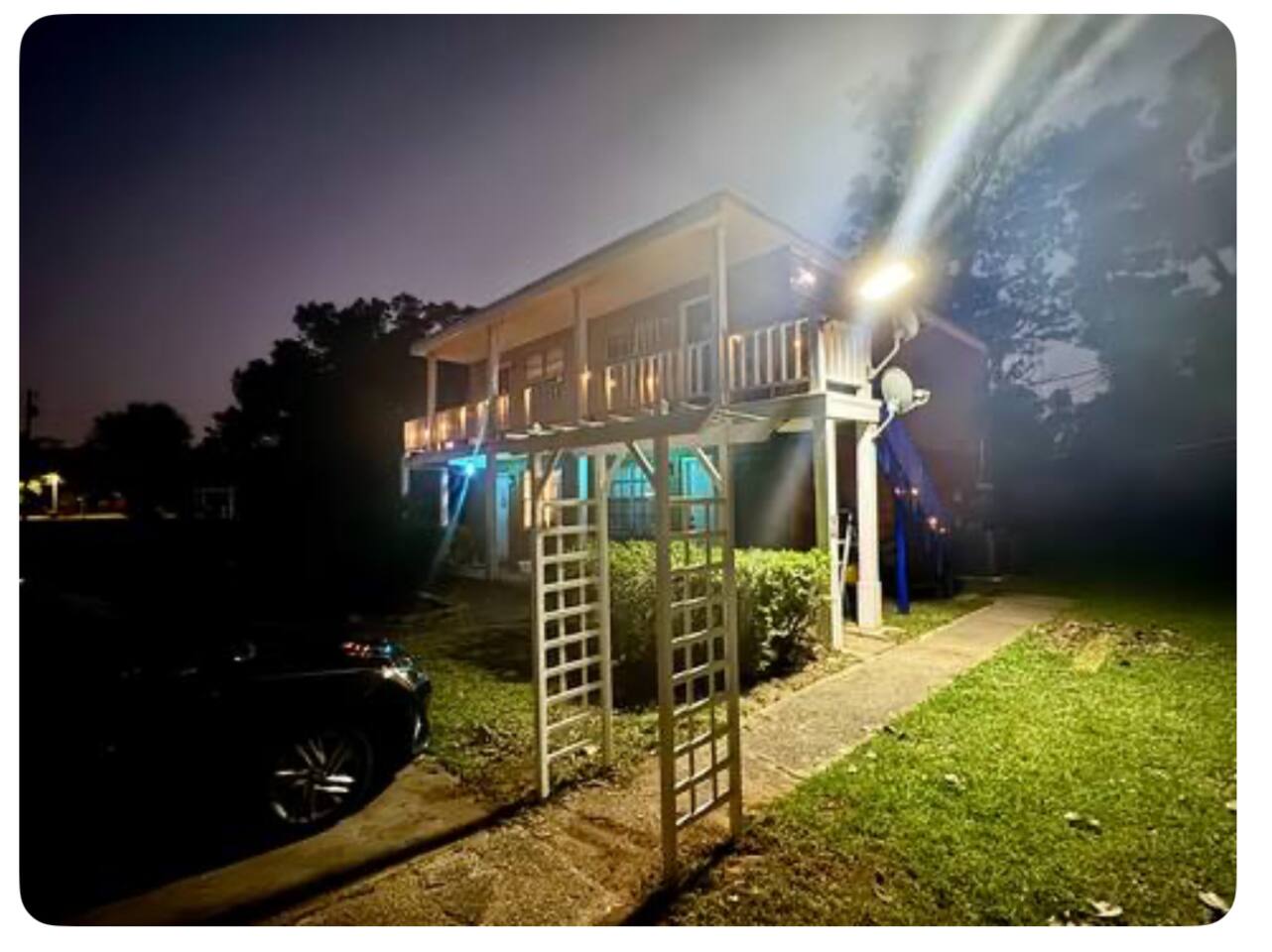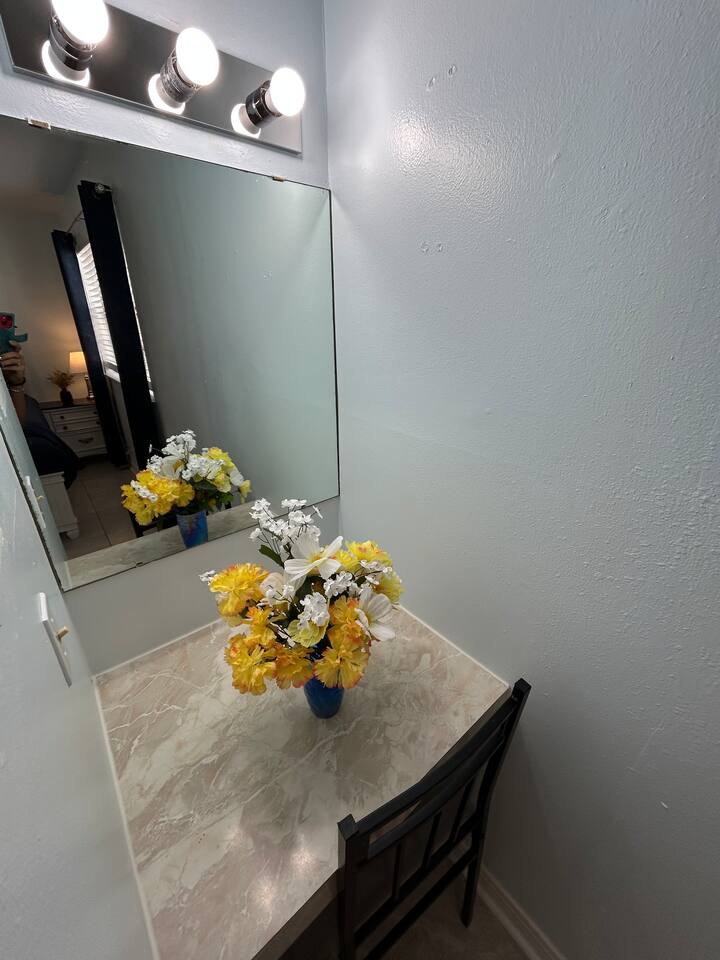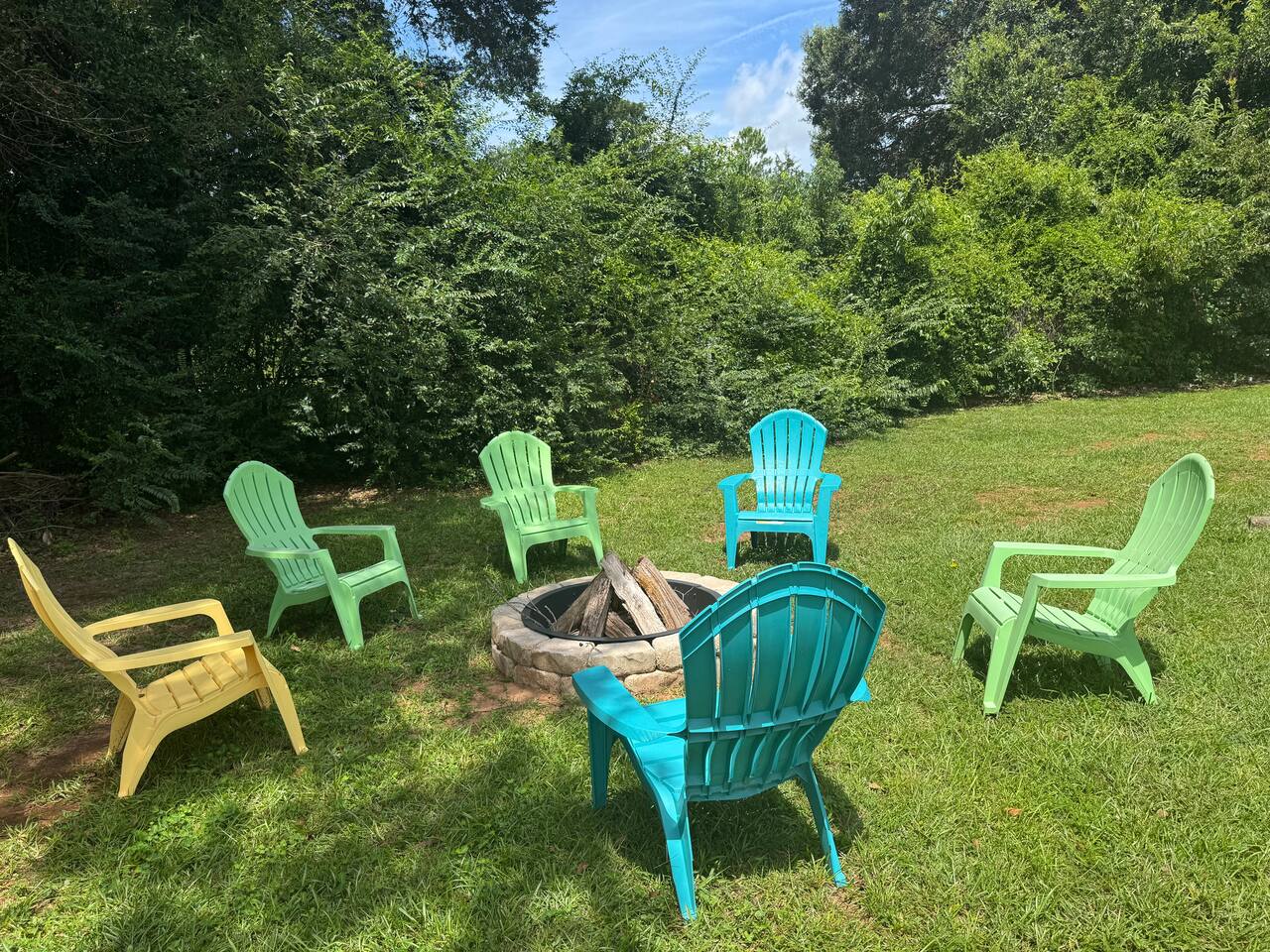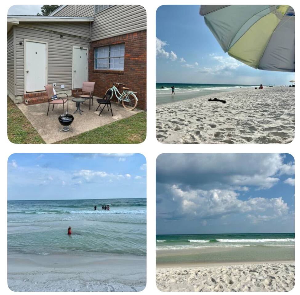 Inside: King bed with blackout curtains 60” smart TV for streaming High-speed Wi-Fi (suitable for remote work and video calls) Retro kitchen with granite countertops and full cookware Updated cabinets, fixtures, and appliances Outdoor shared amenities: Fire pit with seating Volleyball net Grill and picnic gazebo Large, tree-lined yard Shared laundry (washer and dryer) on site This unit is part of a quiet quadplex on a cul-de-sac — peaceful but close to everything. Drive times: Pensacola Beach – 25 minutes Perdido Key – 33 minutes Navy Federal – 7 minutes UWF – 10 minutes Airport – 10 minutes West Florida Hospital – 11 minutes Downtown / Palafox – 16 minutes NAS – 23 minutes